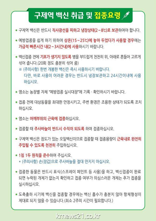 “구제역 백신은 사용 전 상온에 2~3시간 보관 후 접종하고, 거품이 발생하지 않도록 충분히 흔들어 어깨부위 및 둔부 근육에 천천히 삽입 후 충분히 문질러 주는 등 올바른 방법을 준수할 것”을 당부했다.