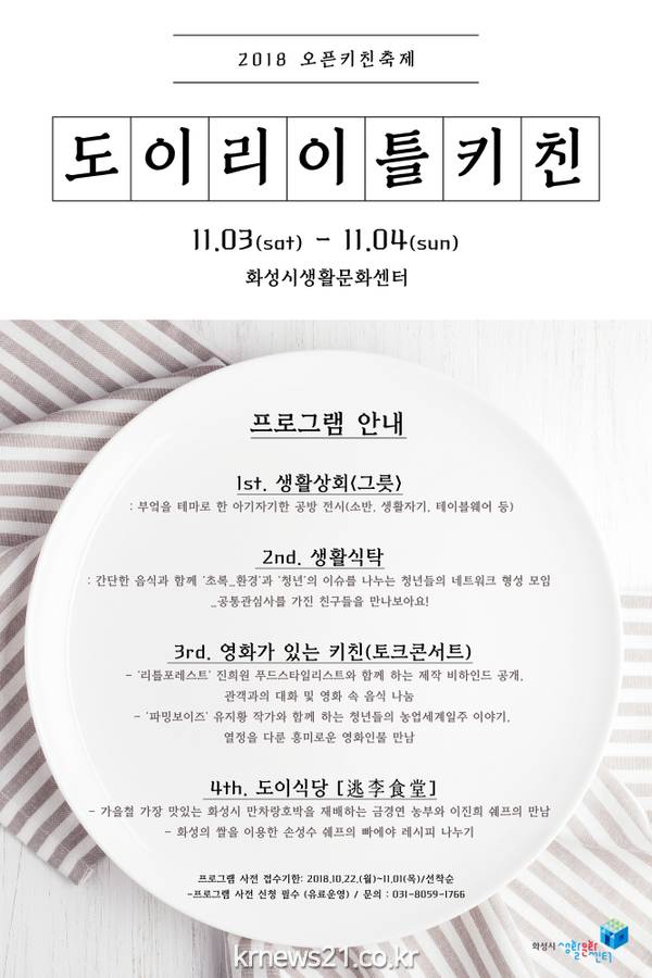▲ (사진=화성시문화재단)(재)화성시문화재단(대표이사 홍범석) 화성시생활문화센터는 오는 11월 3일부터 4일까지 키친을 테마로 이야기를 담은 축제 [오픈키친축제 : 도이리 이틀키친](이하 「도이리 이틀키친」)을 개최한다.