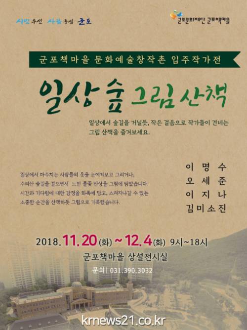▲ (사진=군포문화재단)(재)군포문화재단은 오는 20일부터 군포책마을 상설전시실에서 문화예술창작촌 입주작가展 <일상, 숲, 그림, 산책>을 진행한다.