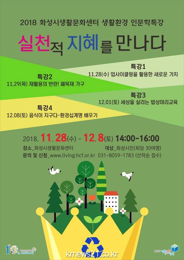 ▲ (사진=화성시문화재단)(재)화성시문화재단 화성시생활문화센터는 오는 11월 28일(수)부터 12월 8일(토)까지 총 4회에 걸쳐 인문학을 바탕으로 생활환경 전반에 대한 경각심을 일깨우고, 일상적 실천 방법을 전하는 ‘생활환경 인문학 특강’을 진행한다.