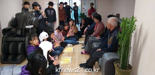 이번 방문에는 대관초등학교 3개 학급 45명이 준비한 떡과 과일이 전달됐으며, 봉사에 참여한 학생들은 대천20, 31, 33통 경로당에서 위문 공연을 펼치고, 어르신들게 말벗과 안마도 해드리면서 즐거운 시간을 보냈다.