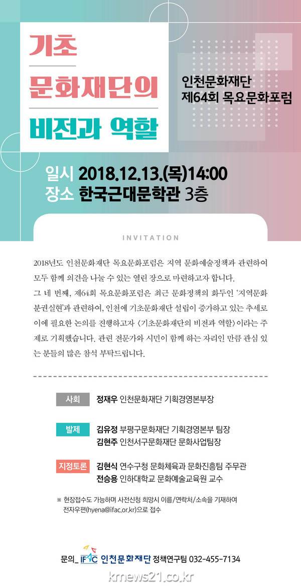 ▲ (사진=인천문화재단)(재)인천문화재단은 제64회 목요문화포럼을 12월 13일(목) 오후 2시에 개최한다. 목요문화포럼은 2008년 ‘목요토론회’라는 이름으로 시작해 지금까지 꾸준히 지역의 문화예술 이슈와 정책에 대해 논의하는 자리로 진행되어 왔다. 이번 목요문화포럼은 <기초문화재단의 비전과 역할>이란 주제로 한국근대문학관 3층에서 진행한다.