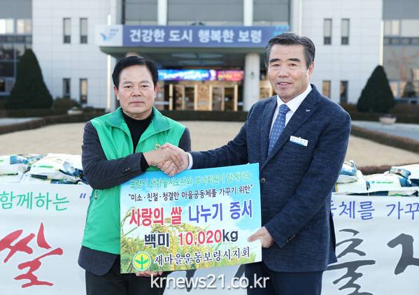 ▲ 쌀 나누기 전달식 장면보령시는 14일 오전 시청 광장에서 김동일 시장과 양완수 새마을운동보령시지회장, 관계자 등 80여 명이 참석한 가운데 사랑의 쌀 나누기 행사를 가졌다.