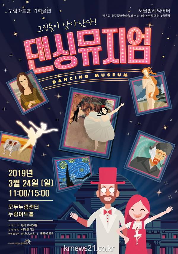 화성시문화재단 누림아트홀 3월 기획공연으로 선보이는 서울발레시어터의 <댄싱뮤지엄>은 쉽게 이해하기 어려운 몸의 언어나 클래식 음악의 깊이를 보다 친근하게 접할 수 있도록 한다. 순수예술에 대한 거부감을 없애기 위해 세상의 모든 미술작품을 상상으로 불러낼 수 있는 신비한 미술관에서 그림 속 캐릭터가 살아나 춤을 추며 벌어지는 좌충우돌 스토리를 연극적 구성으로 담아냈다.
