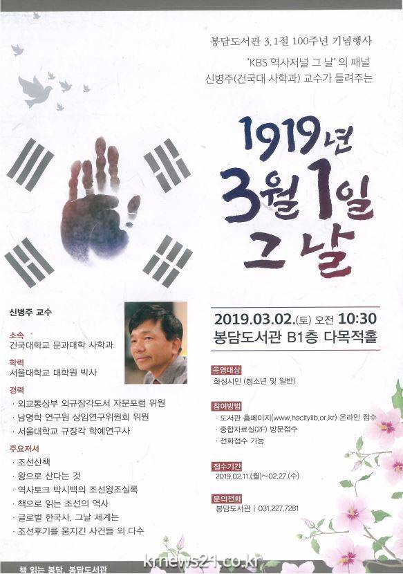 ‘조선산책’, ‘왕으로 산다는 것’, ‘책으로 읽는 조선의 역사’, ‘조선후기를 움직인 사건들’ 외 다수의 저서를 집필하기도 한 신병주 교수는 오는 3월 2일 토요일 10시 30분, 봉담도서관에서 ‘1919년 3월 1일 그날’ 이라는 주제로 화성시민에게 재미와 감동을 선사할 예정이다.