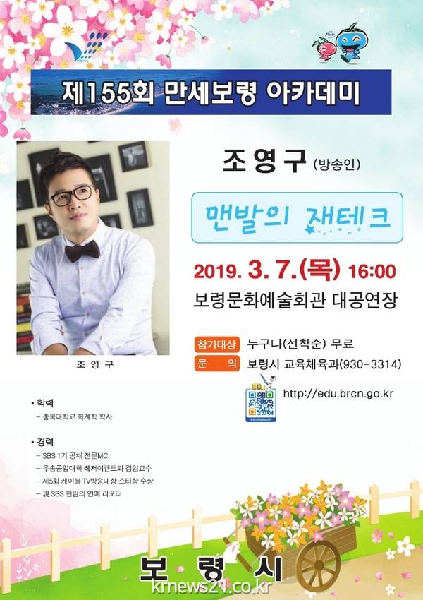 보령시는 오는 7일 오후 4시 보령문화예술회관 대공연장에서 방송인 조영구 씨를 초청해 제155회 만세보령 아카데미를 개강한다고 밝혔다.