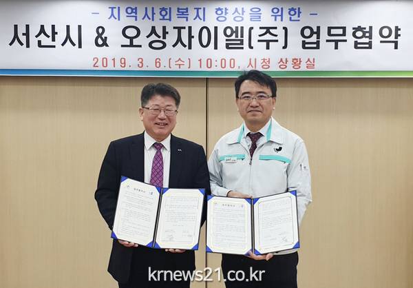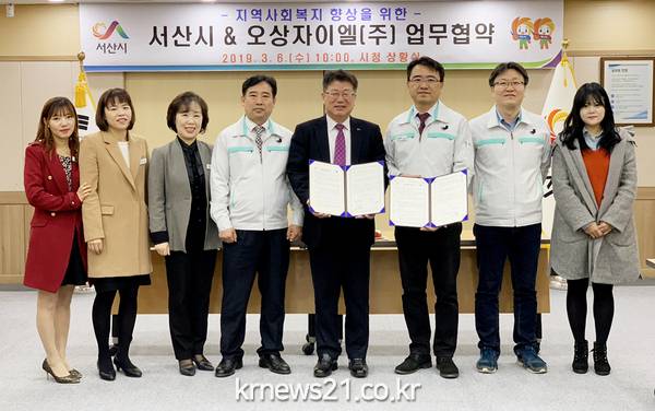 ▲ (사진=서산시 & 오상자이엘 업무협약 모습)서산시는 지역사회복지 향상과 기업체 협력을 통한 커뮤니티 케어 기반을 마련하기 위해 지난 6일 시청 상황실에서 오상자이엘(주)과 업무협약을 체결했다고 밝혔다.