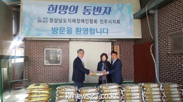 한국농업경영인 진주시연합회(회장 강해옥), 한국여성농업인 진주시연합회(회장 김명순)는 11일 사랑의 쌀 700kg을 진주시 지체장애인협회를 방문해 전달하고 이들을 격려했다.