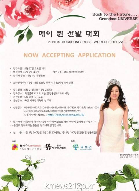 이런 이유로 인생2막 시니어들의 새로운 도전을 리드하고있는 한국시니어스타협회(대표 김선) 예술감독 장기봉은 계절의 여왕 5월 꽃 중의 꽃 장미... 이런 5월 장미 축제기간 중 진정한 지.덕.체를 갖춘 최고의 아름다운 여인을 찾고자 지역 장미축제 중 국내 유일 세계장미축제가 열리고 있는 아름다운 고을 곡성에서 엔터테인먼트의 명문 노리엔터테인먼트와 공동 주최 곡성군의 후원으로 5월 21일부터 24일까지 메이퀸 선발대회를 개최한다.