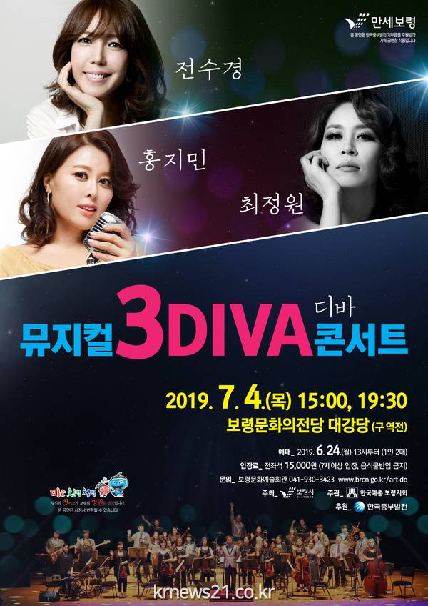 보령시는 오는 7월 4일 오후 3시와 저녁 7시 30분 2회에 걸쳐 보령문화의전당 대강당에서 최정원, 전수경, 홍지민과 뮤지컬 팝스 오케스트라가 협업하는 가운데 뮤지컬 3DIVA 콘서트를 개최한다고 밝혔다.