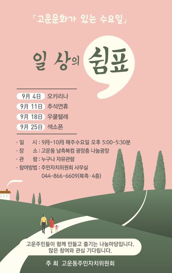세종시특별자치시 고운동 주민자치위원회(위원장 김현경)가 9월 4일부터 매주 수요일 오후 5시부터 30분간 남측 복컴 광장층 나눔광장에서 ‘고운문화가 있는 수요일 행사’를 운영한다.