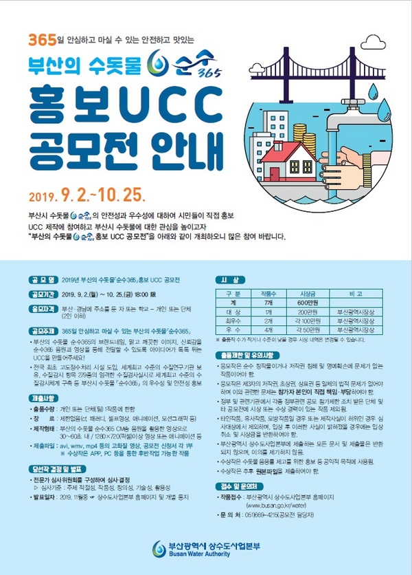 부산시 상수도사업본부(본부장 이근희)는 9월 2일부터 10월 25일까지 ‘부산의 수돗물 「순수365」홍보 유씨씨(UCC, user created contents) 공모전’을 개최한다고 밝혔다.