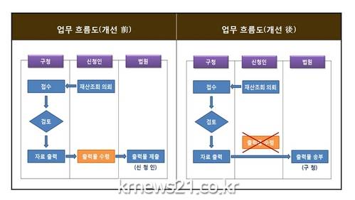 민원인이 ‘개인별 토지 소유 현황’ 신청서에 추가로 마련된 ‘법원명’과 ‘사건번호’를 기재하면, 구가 해당 ‘개인 토지 소유 현황’을 전산 조회하고 그 서류를 민원인을 대신하여 법원에 직접 등기 발송하는 방식이다.