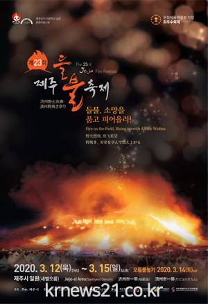 ▲ [사진=홍보포스터]제주시에서는 3월 12일부터 15일까지 4일간 제주시청 및 새별오름 일대에서 개최되는 ‘2020 제주들불축제’를 대한민국 대표 축제로 자리매김하고 세계적인 축제로 도약하기 위한 본격 준비에 돌입했다.