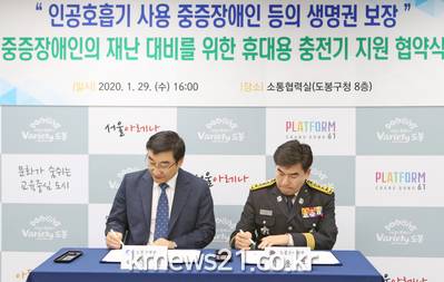 ▲ [사진제공 = 도봉구]도봉구(구청장 이동진)는 1월 29일 도봉구청에서 도봉소방서와 인공호흡기 사용 중증장애인 등의 생명권 보장을 위한 ‘휴대용 충전기 지원 업무협약’을 체결했다.