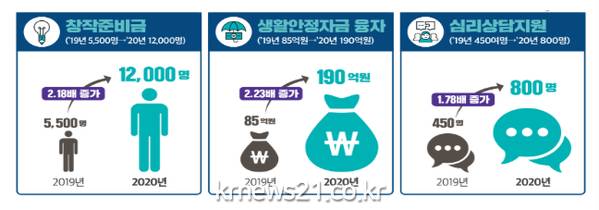 불규칙한 소득으로 일반 금융 서비스를 이용하기 어려웠던 예술인을 위한 안전망도 강화한다. 2019년에 85억 원 규모로 시범 운영했던 생활안정자금 융자를 올해부터 190억 원으로 대폭 확대해 정식 운영한다. 주요 상품인 전‧월세 주택 자금 융자는 주거 부담을 고려해 상한액을 1억 원까지 높인다.