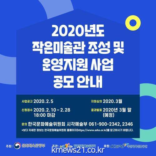 ▲ [사진=홍보포스터]문화체육관광부(장관 박양우, 이하 문체부)는 한국문화예술위원회(위원장 박종관, 이하 예술위), 국민체육진흥공단(이사장 조재기)과 함께 2월 28일(금)까지 ‘2020년 작은미술관 조성 및 운영 지원’ 사업의 대상 기관을 공모한다.