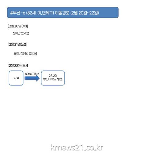 24일 부산시에 따르면 6번 확진자(연제구 82세 여성)는 20일부터 21일까지 집에서 머무르다 22일 확진 판정을 받고 보건소 구급차를 이용해 부산대학교 병원으로 이송됐다.