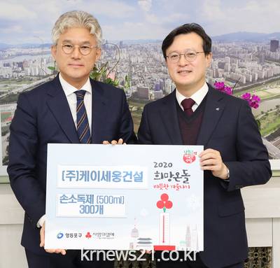 지난 19일 오후 5시, 채현일 영등포구청장은 구청 본관에서 ㈜케이세웅건설 유진현 회장과 함께 ‘취약계층 및 소규모 복지시설 손 소독제 지원 전달식’을 갖고 유진현 회장에게 감사의 뜻을 전했다.