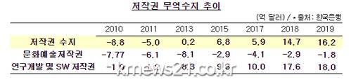 문화체육관광부(장관 박양우, 이하 문체부)는 2010년부터 2019년까지 ‘지식재산권 무역수지’ 자료를 종합적으로 분석한 결과, 우리나라의 저작권 무역수지는 지난 10년간 총 25억 달러(약 3조 원) 규모의 성장을 이뤄 왔으며, 2013년부터는 7년 연속으로 무역수지 흑자를 기록하고 있다고 밝혔다.
