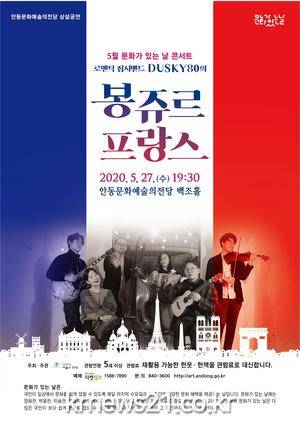 5월 문화가 있는 날 콘서트는 그윽한 아름다움이 묻어나는 프랑스 파리의 길거리 속에 있는 듯한 감성을 느낄 수 있는‘로맨틱 집시 밴드 DUSKY80의 봉쥬르 프랑스’ 공연으로 오는 27일 저녁 7시 30분 안동문화예술의전당 유튜브와 페이스북을 통해 생방송으로 만날 수 있다.
