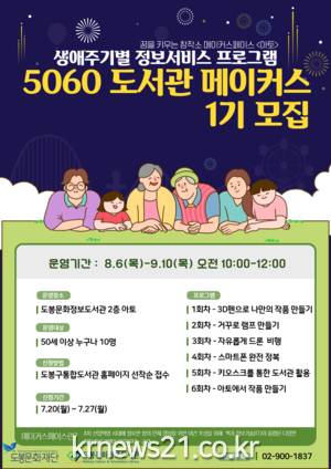 ▲ [사진=홍보포스터]도봉구(구청장 이동진)는 오는 8월 6일부터 10월 29일까지 석 달 간 매주 목요일 도봉문화정보도서관에서 생애주기별 정보서비스 프로그램 ‘5060 도서관 메이커스’를 운영한다.
