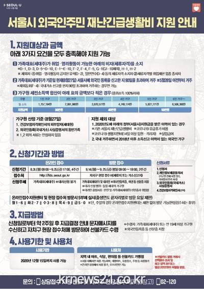 지원대상은 서울시에 외국인 등록 거소신고 후 90일이 경과했으며(8월 27일 기준), 국내에서 합법적으로 취업・영리활동을 할 수 있는 외국인 주민이다.