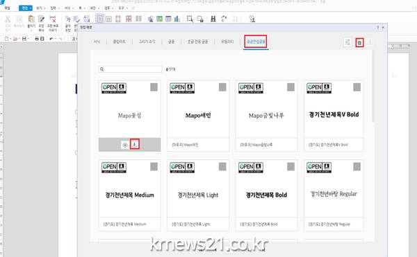 한컴오피스 2018 또는 2020을 실행한 후, 글꼴목록에서 ‘공공 안심글꼴’ 표시를 선택하면 안심글꼴파일 57종을 내려받을 수 있는 창으로 연결된다. 국민 누구나 원하는 글꼴을 쉽게 찾아 내려받을 수 있으며, 내려받은 글꼴은 문서 작성 시 바로 사용할 수 있다. 이 밖에도 한글과컴퓨터 웹 서비스(한컴애셋, 한컴스페이스, 한컴오피스웹) 또는 한컴오피스 내 [문서시작 도우미] 메뉴를 통해서도 안심글꼴파일을 내려받을 수 있다.