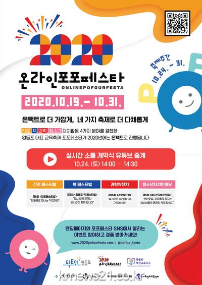 채현일 영등포구청장은 “감염병 예방을 위해 영등포 대표 교육축제인 포포페스타를 올해는 온라인으로 개최한다”며, “코로나19로 지치고 힘든 구민들이 온라인 축제를 통해 치유와 희망의 에너지를 얻기 바란다”고 전했다.