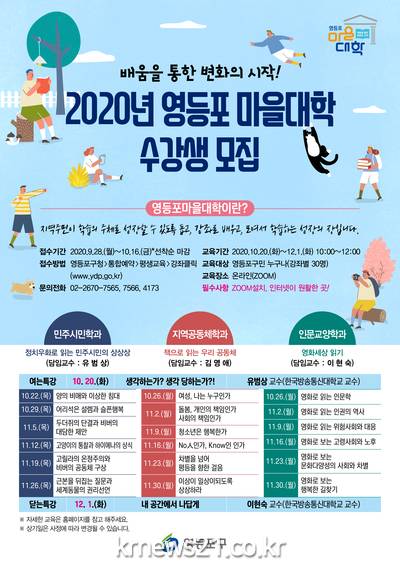 ▲ [사진=홍보포스터]영등포구(구청장 채현일)가 오는 20일부터 개강하는 ‘영등포 마을대학’의 수강생을 모집한다. 코로나19 확산을 방지하고 2021년 개관 예정인 YDP미래평생학습관에서의 본격 운영에 앞서 온라인 방식의 시범 운영으로 평생학습 문화 조성에 나선다.