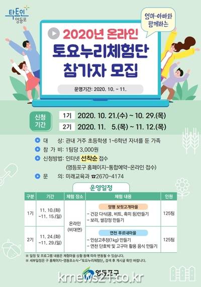 ▲ [사진=홍보포스터]영등포구(구청장 채현일)는 초등학생 자녀를 둔 가족을 대상으로 농촌체험학습 프로그램인 ‘2020년 영등포 온라인 토요누리체험단’을 오는 11월 10일부터 운영한다.