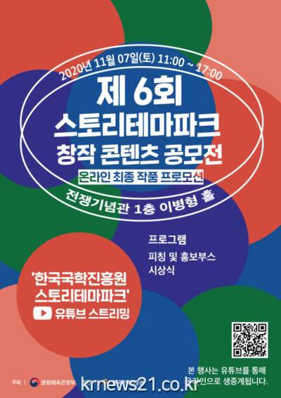 ‘스토리테마파크 창작 콘텐츠 공모전’은 청년들이 ‘스토리테마파크’에 있는 전통 소재를 활용해 만든 우수한 콘텐츠 기획안을 발굴하기 위해 마련됐다. 이 공모전에서는 응모된 영화시나리오와 웹툰, 웹드라마, 게임 기획 등을 심사해 최종 후보작에는 전문가 지도를 받아 심화할 수 있는 기회를 제공하고 있다.