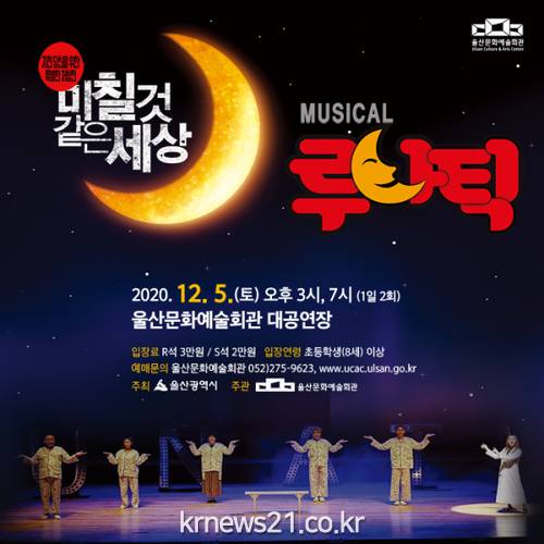 문화예술회관 관계자는 “웃음과 감동이 넘쳐나는 뮤지컬 ‘루나틱’을 통해 지친 마음의 무게를 덜어내는 위로의 시간이 되길 바란다.”며 “올 한해 코로나19 방역에 애쓴 지역 의료진과 대학수학능력시험 수험생 대상으로 50% 특별 할인도 제공한다."라고 말했다.
