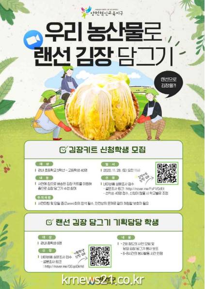 ▲ [사진=홍보포스터]양천구(구청장 김수영)가 이달 28일(토) 관내 초중고생 20명을 대상으로 우리 농산물을 활용한 랜선 김장 체험 교실을 진행한다고 밝혔다.
