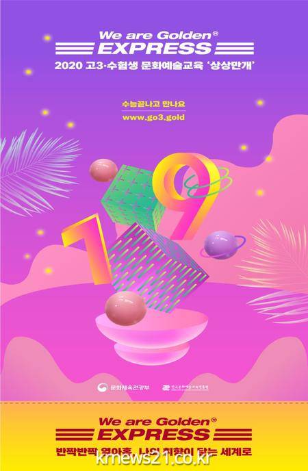 ▲ [사진=홍보포스터]문화체육관광부(장관 박양우, 이하 문체부)는 한국문화예술교육진흥원(원장 이규석, 이하 교육진흥원)과 함께 대학수학능력시험(12. 3. 이하 수능)을 치른 고 3, 수험생들이 문화예술교육으로 자신의 꿈을 찾을 수 있도록 12월 3일(목)부터 2021년 1월 15일(금)까지 ‘2020 상상만개-반짝반짝 열아홉, 나의 취향이 닿는 세계로’를 비대면으로 운영한다.