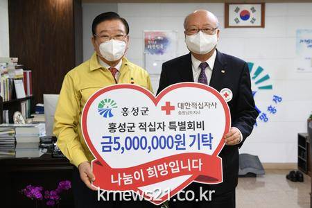 ▲ [사진제공 = 홍성군]김석환 홍성군수는 지난 19일 군수실에서 유창기 대한적십자사 충남지사회장이 참석한 가운데 ‘2021년도 적십자 희망 나눔 특별성금’으로 500만원을 전달했다.