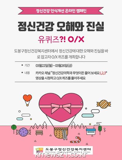 코로나19가 장기화되며 코로나블루를 비롯한 정신건강에 대한 주민들의 관심도가 높아지는 가운데, 도봉구에서는 “온라인 캠페인 유퀴즈?! O/X“로 정신건강에 대한 올바른 정보를 제공하고, 정신건강에 대한 잘못된 인식들을 해소하고자 한다.