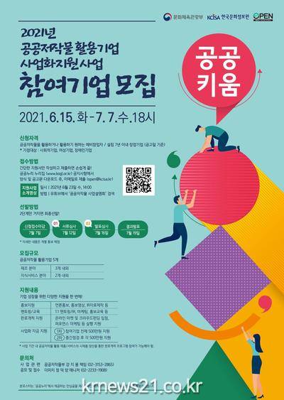 ▲ [사진=홍보포스터]문화체육관광부(장관 황희, 이하 문체부)는 한국문화정보원(원장 홍희경, 이하 문정원)과 함께 6월 15일(화)부터 7월 7일(수)까지 공공저작물 활용을 지원하는 ‘공공키움 사업’에 참여할 민간 기업을 모집한다.