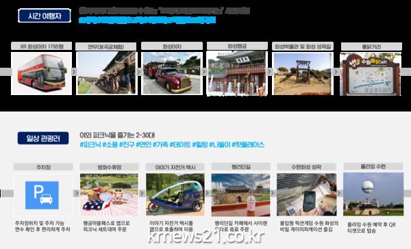 ‘수원시’는 ‘18세기 조선 신도시로의 스마트한 여행 구현’을 주제로, ‘수원화성 관광특구’를 지능형(스마트)관광 요소가 집약된 구역으로 만든다. 특히 물리적으로 훼손하면 안 되는 세계유산의 특성과 성안마을의 지역관광 상생 모델을 고려해 사업계획을 수립했다. 앞으로 국비 35억 원, 시비 및 민간투자비 등 사업비 총 70억 원을 투입해 ▲ 수원화성의 미개방·미복원 유적지를 가상·증강현실로 구현한 체험형 콘텐츠, ▲ 현 위치 기반 주변 관광정보 제공 및 증강현실 길 안내, ▲ 끊김 없는 관광 이동 구현을 위한 교통정보 통합 제공 및 실시간 주차장 안내, ▲ 지역상권 가맹점 대상 비대면 예약·선주문·결제 서비스 등을 제공할 계획이다.