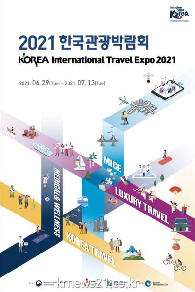 ▲ [사진=홍보포스터]문화체육관광부(장관 황희, 이하 문체부)가 주최하고, 한국관광공사(사장 안영배)와 인천관광공사(사장 민민홍)가 주관하는 ‘2021 한국관광박람회(Korea International Travel Expo)’가 6월 29일(화)부터 7월 13일(화)까지 인천광역시 파라다이스호텔과 공식 누리집(www.kite2021.com)에서 열린다.