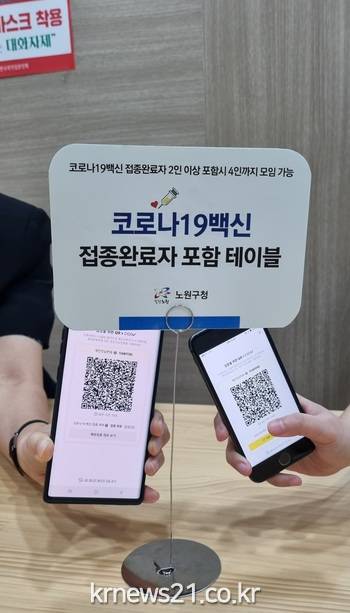 업소에서는 이용객의 백신 접종완료 여부 확인 후, 배부된 안내판을 각 테이블에 설치해 접종완료자가 포함된 자리임을 표시하면 된다. 이용객 입장에서도 방역수칙을 준수하는 업소임을 한 눈에 확인할 수 있어 안심하고 이용이 가능하다.