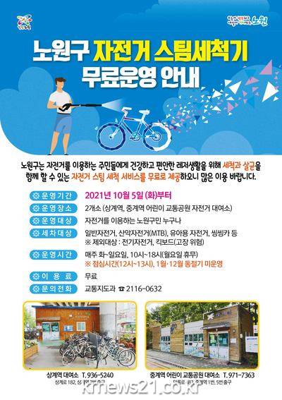 스팀 세척 서비스는 매주 화요일부터 일요일까지 운영한다. 오전 10시~오후 6시(점심시간인 12시~13시 제외)에 중계동 어린이 교통공원 자전거 대여소와 상계역 4번 출구 자전거대여소에 방문하면 이용할 수 있다.