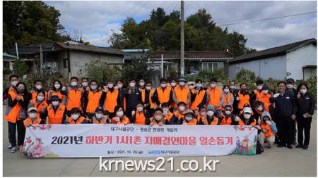 ▲ [사진제공 = 대구광역시]대구시설공단(이사장 최길영)은 10월 29일(금) 1사1촌 자매결연마을인 경북 청송군 현동면 개일리에서 농촌 일손 돕기 봉사를 진행했다고 밝혔다.