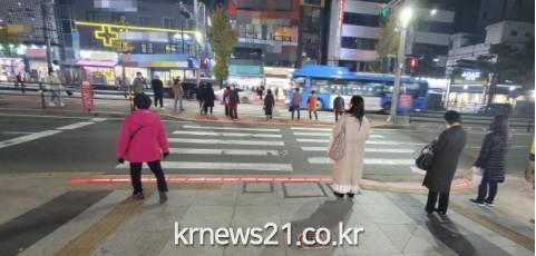 설치구간은 사거리, 사고 다발지역, 초등학교 앞, 버스중앙차로 주변 등이다. 구는 총 161개 구역에 바닥신호등을 달기로 했다. 상반기에 58개를 끝냈고 이달까지 113곳을 추가 조성할 계획이다.