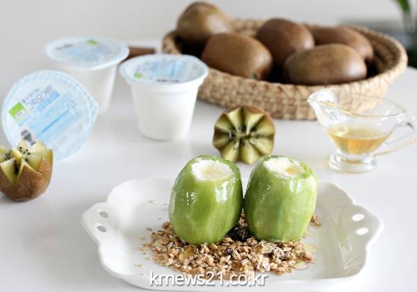 ▲ 사진=풀무원다논 제공'그릭 요거트 키위'는 복숭아 과육 안에 그릭 요거트를 넣어 차갑게 즐기는 디저트 '그릭 복숭아'를 변형해 만든 메뉴다. 복숭아 대신 키위를 활용하면 더욱 상큼하게 즐길 수 있다. 그릭 키위를 깨끗이 씻어 양 끝을 조금 자른 후 키위의 중앙 부분에 동그랗게 칼집을 내어 심을 모두 파낸 뒤 그 안에 '풀무원다논 그릭' 요거트를 채워 넣는다. 냉동실에서 1시간 정도 굳힌 후 껍질을 벗겨 그래놀라와 꿀, 메이플 시럽 등을 기호에 맞게 곁들여 즐기면 된다.