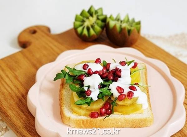 ▲ 사진=풀무원다논 제공'키위 요거트 오픈 샌드위치'는 비주얼과 포만감을 모두 갖춘 브런치 메뉴다. 구운 식빵에 체다 슬라이스 치즈를 깔고 그릭 키위를 적당량 올려 준다. 그 위에 와일드루꼴라와 석류 알갱이를 토핑으로 얹고 '풀무원다논 그릭' 요거트를 드레싱처럼 뿌려 완성한다. 조리법이 간단하고 든든한 포만감을 선사해 바쁜 아침 간편한 식사 대용으로도 알맞다.