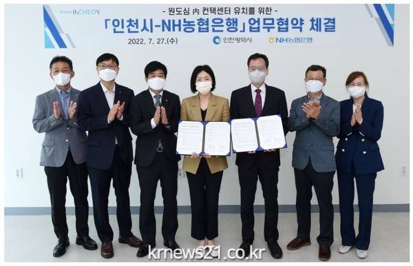 ▲ 사진=인천광역시인천광역시(시장 유정복)는 7월 27일 인천시청 신관 회의실에서 NH농협은행(은행장 권준학)과 컨텍센터 유치관련 업무협약을 체결했다고 밝혔다.