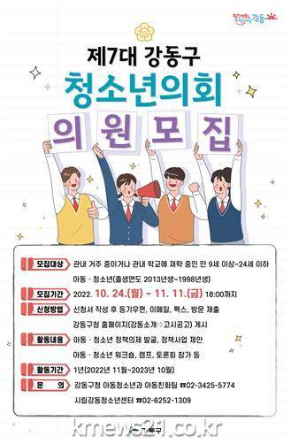 ▲ 사진=강동구 제공강동구(구청장 이수희)는 오는 11월 11일까지 강동구 아동・청소년을 대상으로 ‘제7대 강동구 청소년의회’ 의원을 모집한다고 밝혔다.