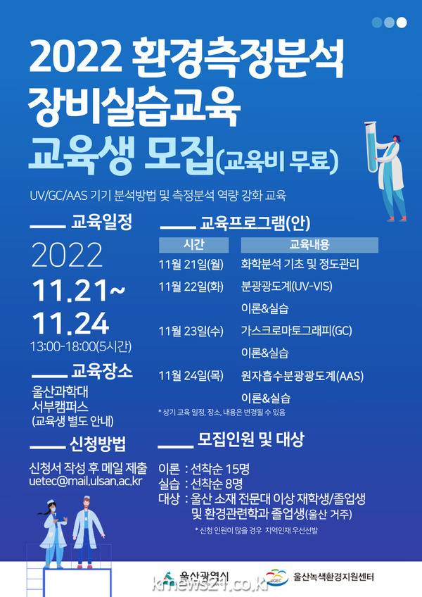 ▲ 사진=울산광역시울산시는 울산녹색환경지원센터(센터장 유익근) 주관으로 11월 21일부터 24일까지 울산과학대학교 서부캠퍼스에서 지역환경인재 취업역량 강화를 위한 ‘2022 환경측정분석 장비실습교육’을 실시한다고 밝혔다.