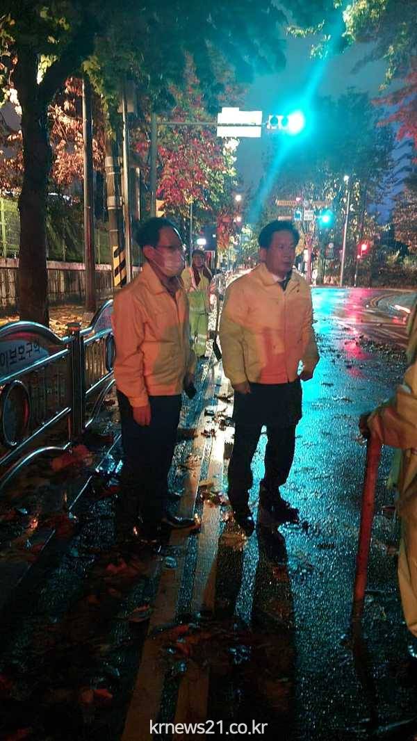마포구에서도 공덕역 교차로 등 일부도로가 낙엽 등으로 도로변 빗물받이 배수가 원활치 못해 침수가 발생했다. 이에, 박강수 구청장은 직원들과 현장을 찾아 직접 빗물받이를 막고 있는 낙엽 등을 제거해 추가 침수를 막고 수해 방지를 위한 순찰을 강화했다.